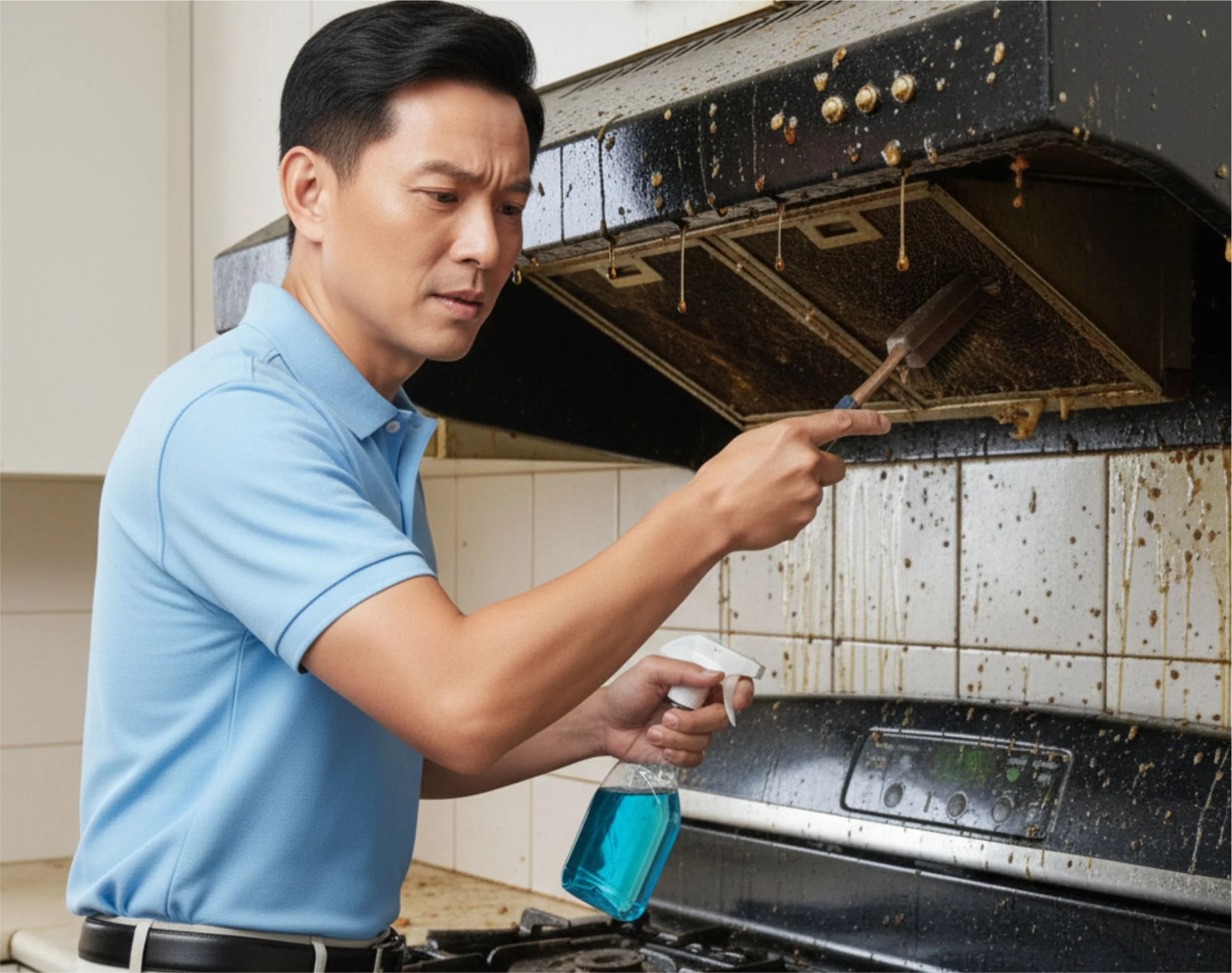 抽油煙機的油垢像一層「黃金甲」,爐台四周焦痕,怎麼刷都還是髒。